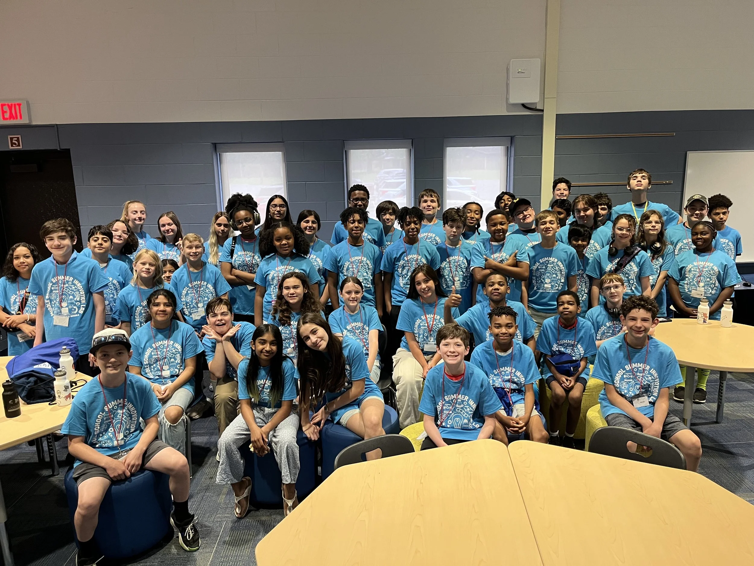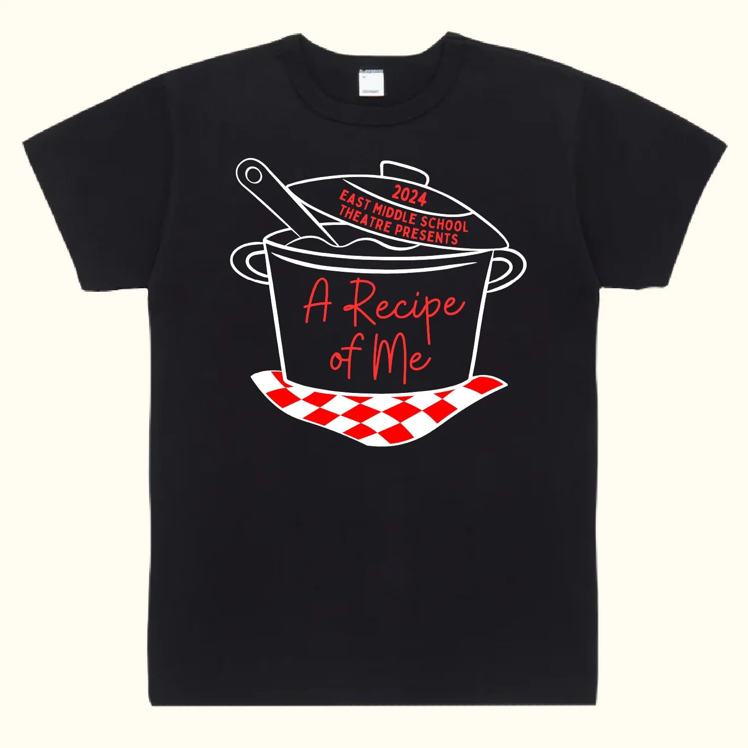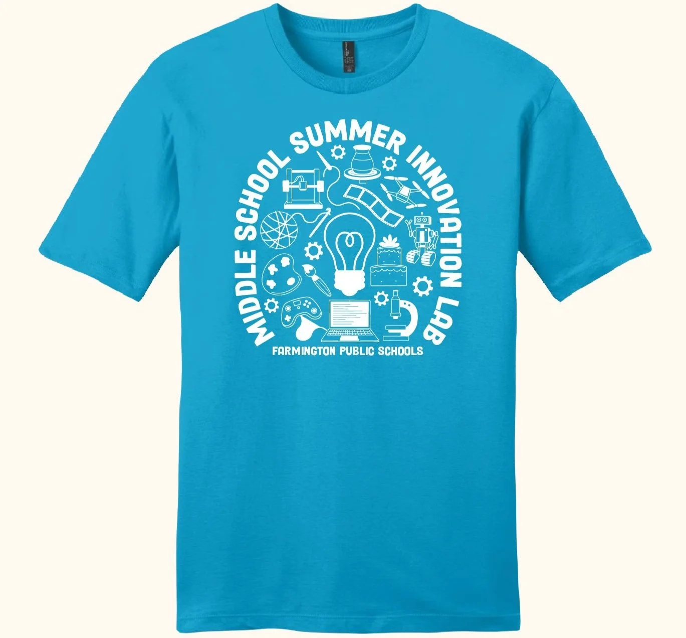 Various shirt designs for East Middle School include staff spirit wear, school play merchandise, and Summer Innovation Camp spirit wear.