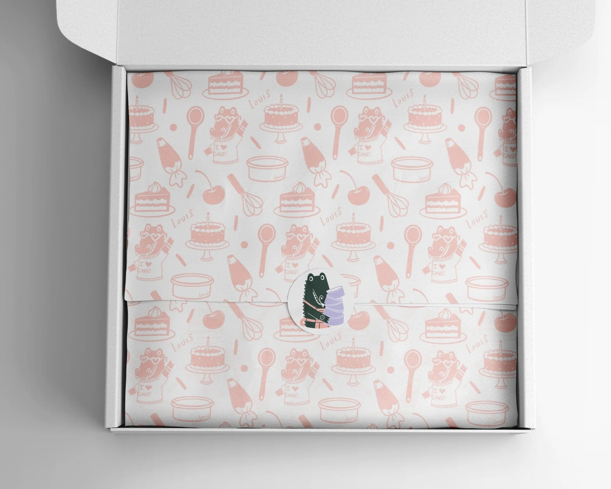 Just in time for their new cake pan release, a new shipping tape, tissue paper, sticker sheet, and informational insert were designed.