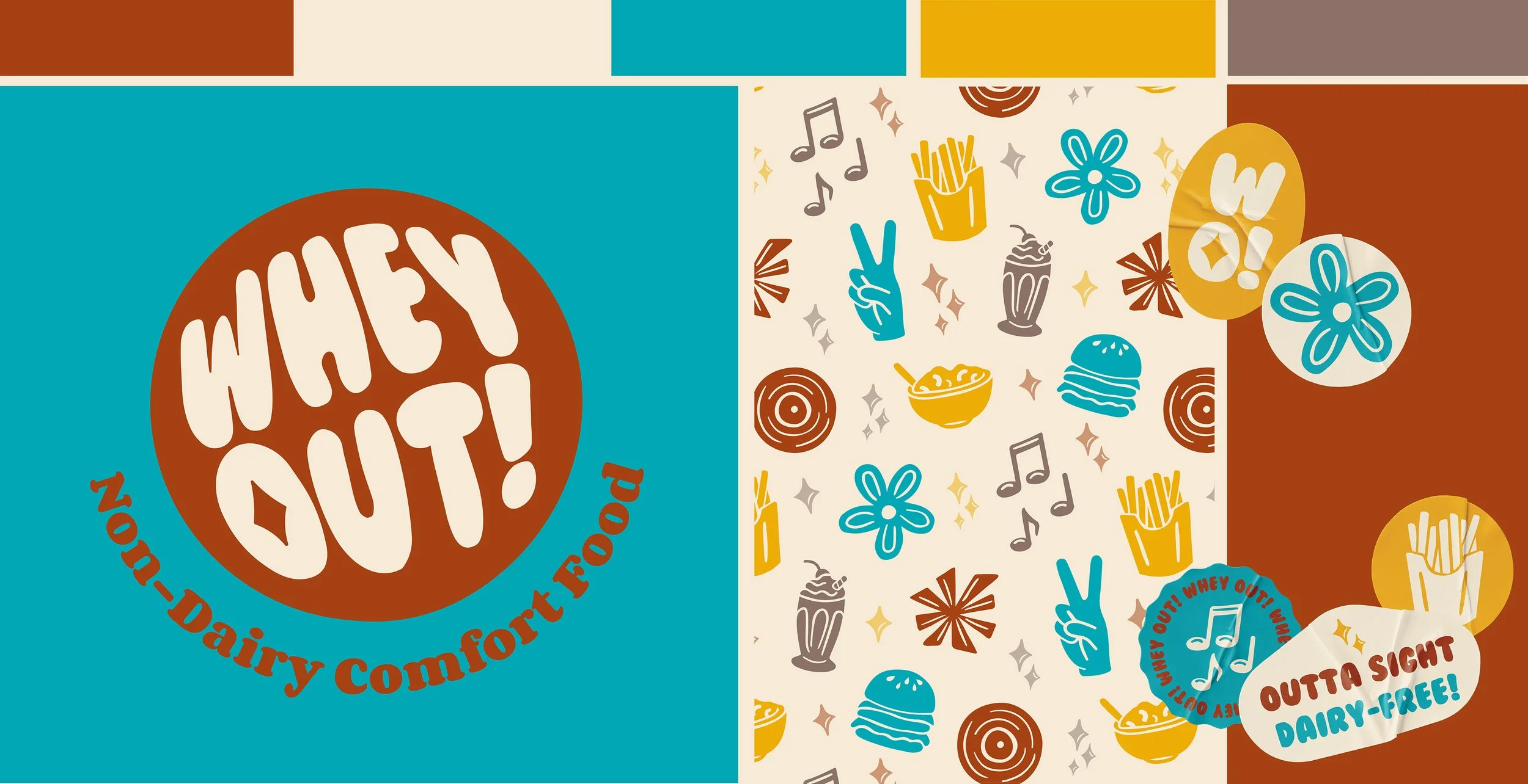 The brand design for Whey Out! is inspired by the visual identity of the 1960's-70's. Elements of this inspiration are found in the patterns, colors, and language.